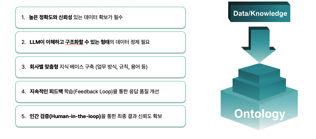 LLM이 실제 실무에서 '에이전트(Agent)'로서 제 역할을 다하기 위해서는 단순한 언어 생성을 넘어 팀의 업무 노하우와 높은 수준의 데이터 신뢰도를 갖춰야 합니다.