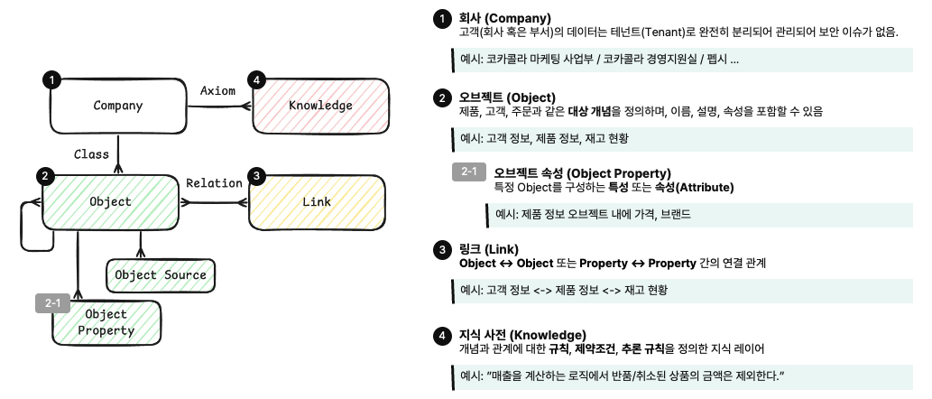 - 지식 사전 (Knowledge): 비즈니스 로직, 제약 조건, 추론 규칙을 담고 있습니다. "매출 계산 시 취소 상품 금액은 제외한다"와 같은 기업 고유의 규칙이 여기에 포함됩니다.