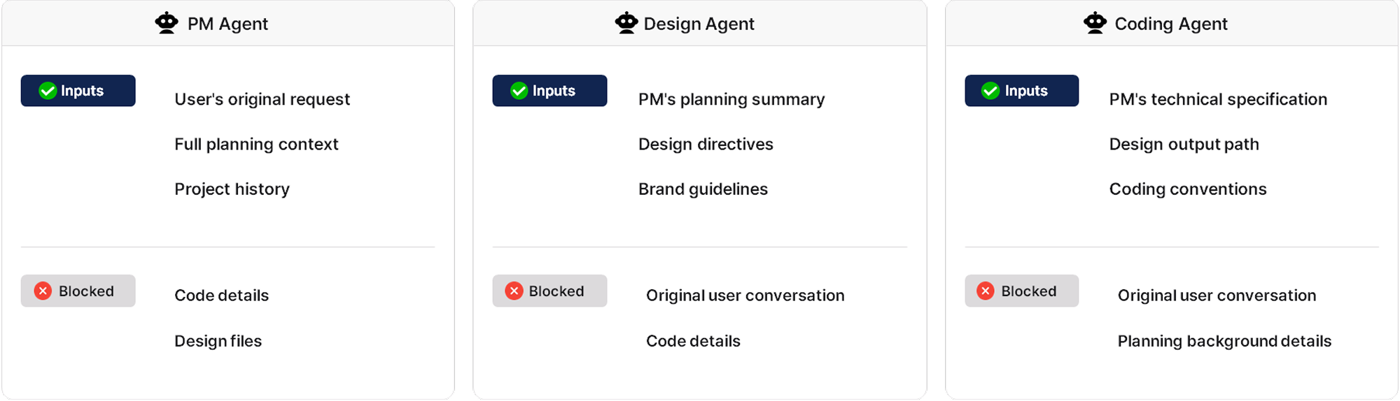 PM Agent는 사용자의 원본 요청과 전체 기획 맥락, 프로젝트 히스토리를 받지만 코드 상세나 디자인 파일은 보지 않습니다. Design Agent는 PM이 정리한 기획 요약과 디자인 지시사항, 브랜드 가이드만 받고 사용자와의 원본 대화나 상세한 코드 구축 내용은 보지 않습니다.