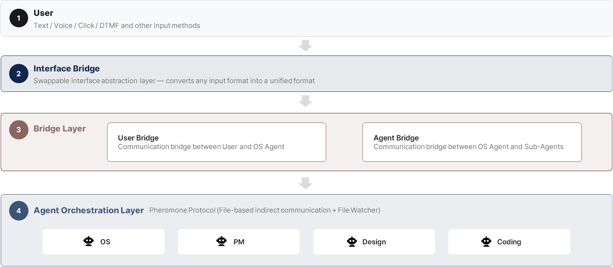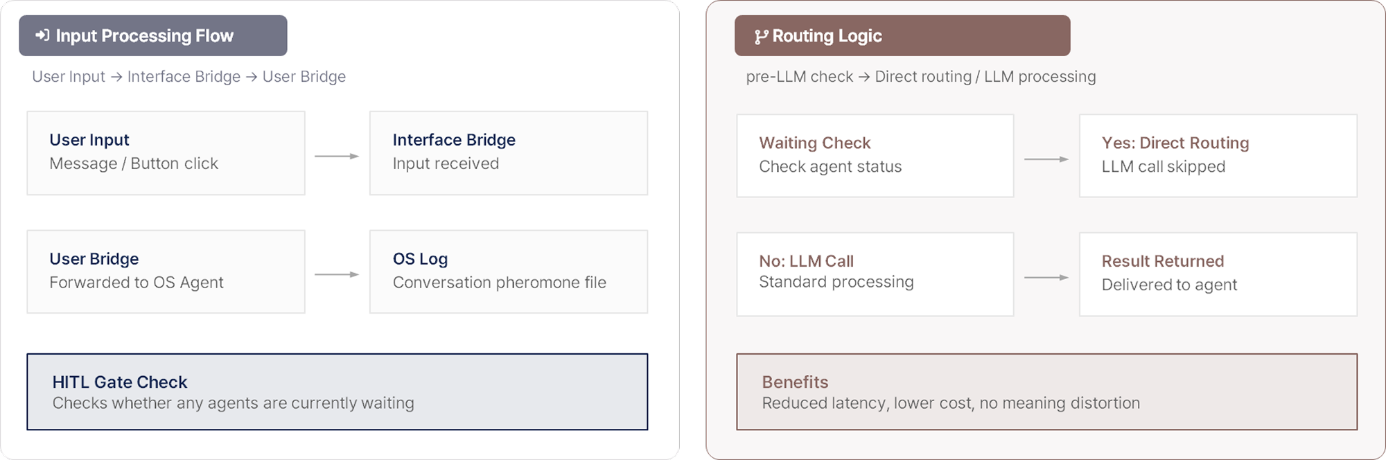 사용자가 선택하면 입력이 User Bridge를 통해 OS Agent에 전달됩니다. OS Agent는 LLM을 호출하기 전에 현재 대기 중인 에이전트가 있는지 확인합니다. 대기 에이전트가 존재하면 LLM 호출 없이 해당 에이전트에게 직접 라우팅합니다. 지연 감소, 비용 절감, 의미 왜곡 방지가 동시에 달성됩니다.