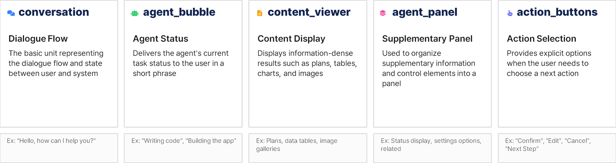 에이전트는 특정 UI 구현 방식에 의존하지 않고, 5가지 표준 이벤트만 발행합니다. conversation은 사용자와 시스템 간의 대화 흐름을 담습니다. agent_bubble은 에이전트의 현재 작업 상태를 짧은 문장으로 전달합니다. content_viewer는 기획서, 표, 이미지 갤러리처럼 정보 밀도가 높은 결과를 표시합니다. agent_panel은 보조 정보와 제어 요소를 패널 형태로 구성합니다. action_buttons는 사용자가 다음 행동을 선택해야 할 때 선택지를 제공합니다.
