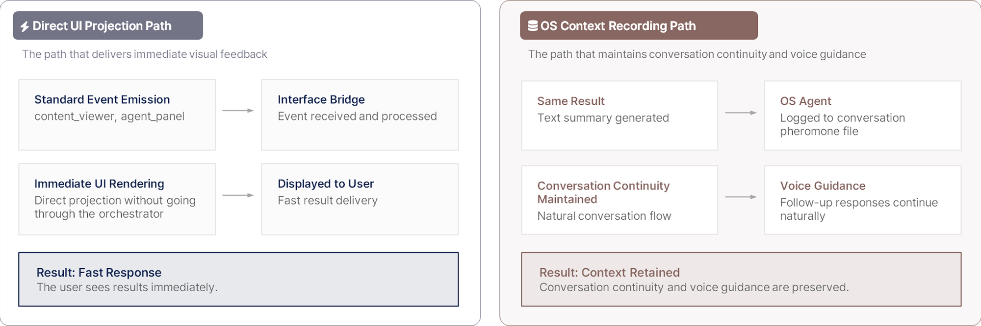 UI 직접 투사 경로는 content_viewer, agent_panel 등의 표준 이벤트를 Interface Bridge가 받아 사용자에게 즉시 전달합니다. 오케스트레이터를 거치지 않고 직접 투사하기 때문에 응답이 빠릅니다.