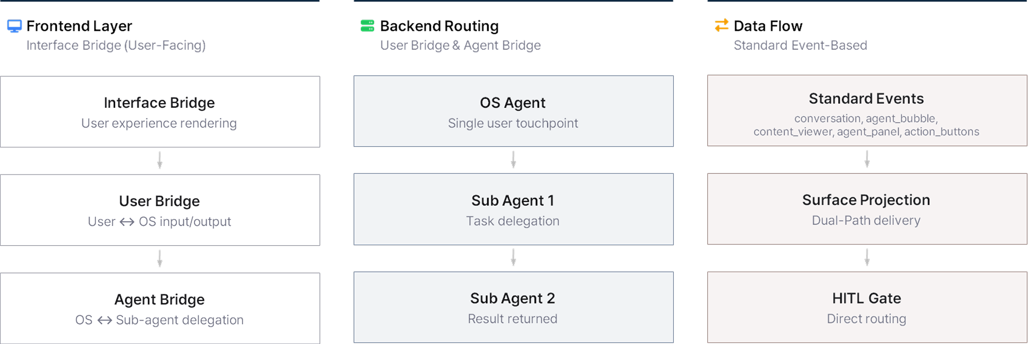 에이전트 시스템 내부에서는 기획서, 이미지, 코드, 진행 상태 등 다양한 형태의 결과가 생성됩니다. 이것들이 웹, 모바일, 음성 등 서로 다른 환경에서 각각 다른 방식으로 표현되어야 합니다. Interface Bridge는 이 문제를 해결하기 위한 계층입니다.