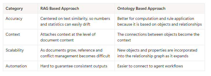 For example, if you ask why review ratings dropped, an LLM may produce a plausible explanation that is still hallucinated and disconnected from the true cause. But if an ontology connects the stages of "product, promotion, shipping, customer service, review, repurchase" and defines the properties and rules at each stage, the answer shifts into evidence based insights that can be applied directly in real operations.