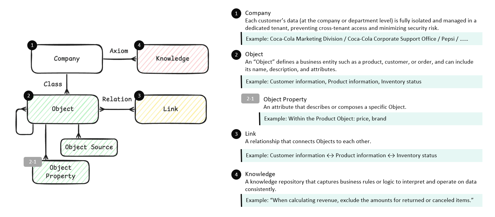 - Link: Defines connections between objects to surface hidden context and meaning. For example, it can reveal derived relationships across "revenue, promotion, review".