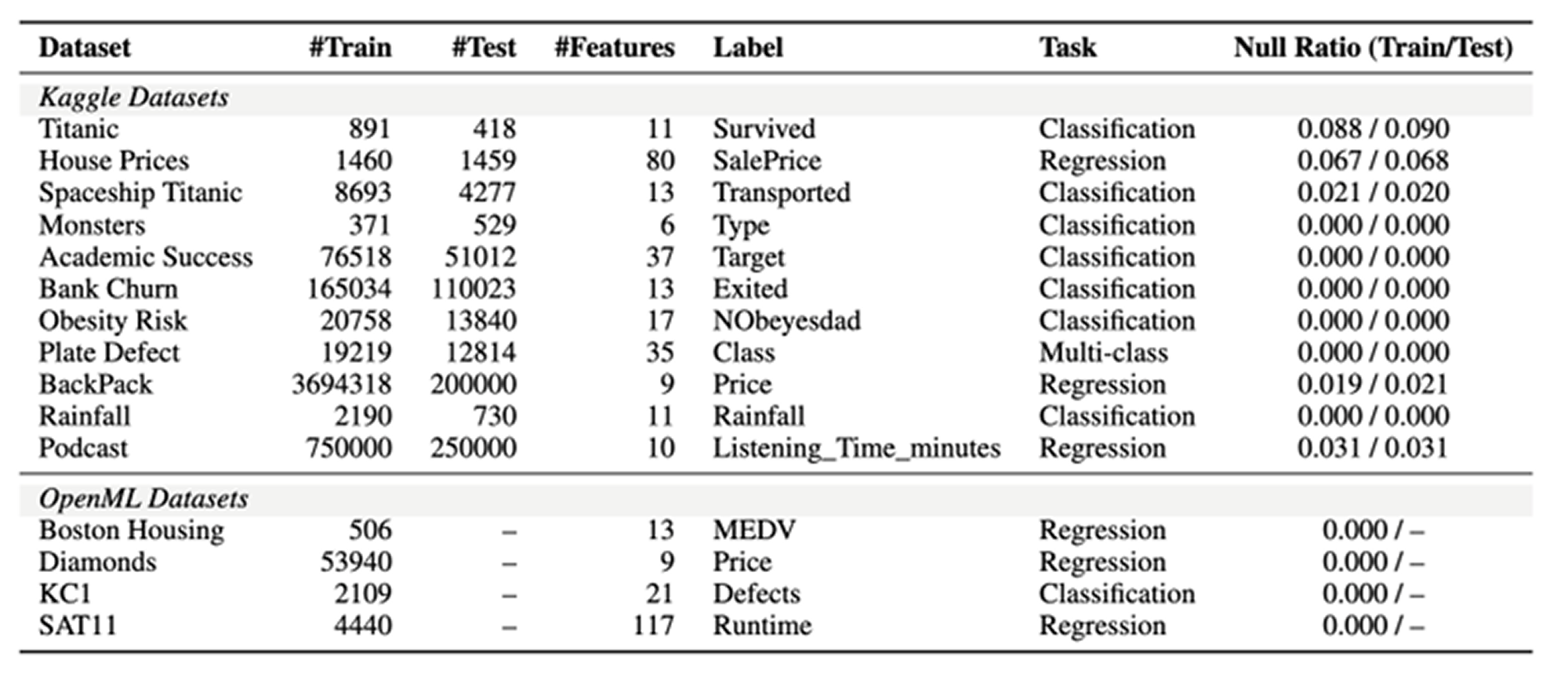 - Datasets: 8 Kaggle datasets, 4 OpenML datasets