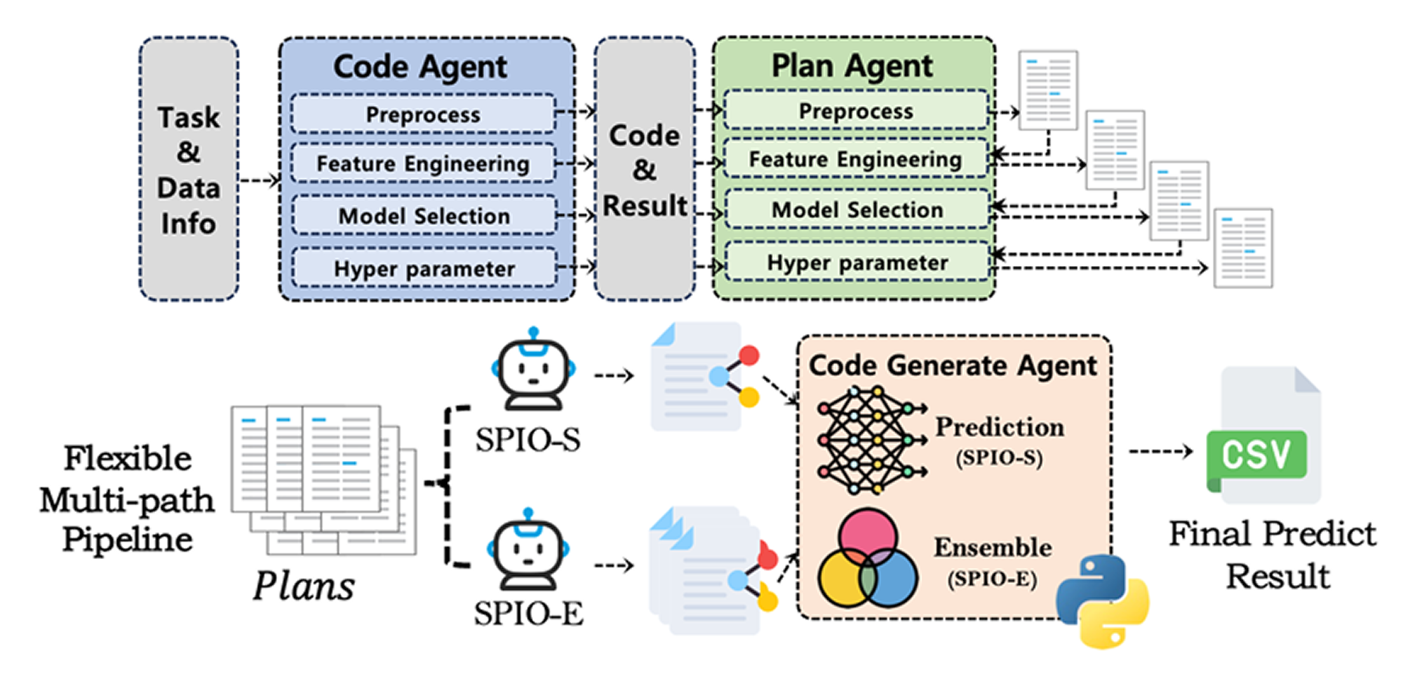 - SPIO has two variants: SPIO-S, which selects the single best pipeline, and SPIO-E, which ensembles top-ranked pipelines for stronger robustness. The framework conditions later decisions on intermediate evidence, making the pipeline more adaptive and more traceable than prior multi-agent systems.