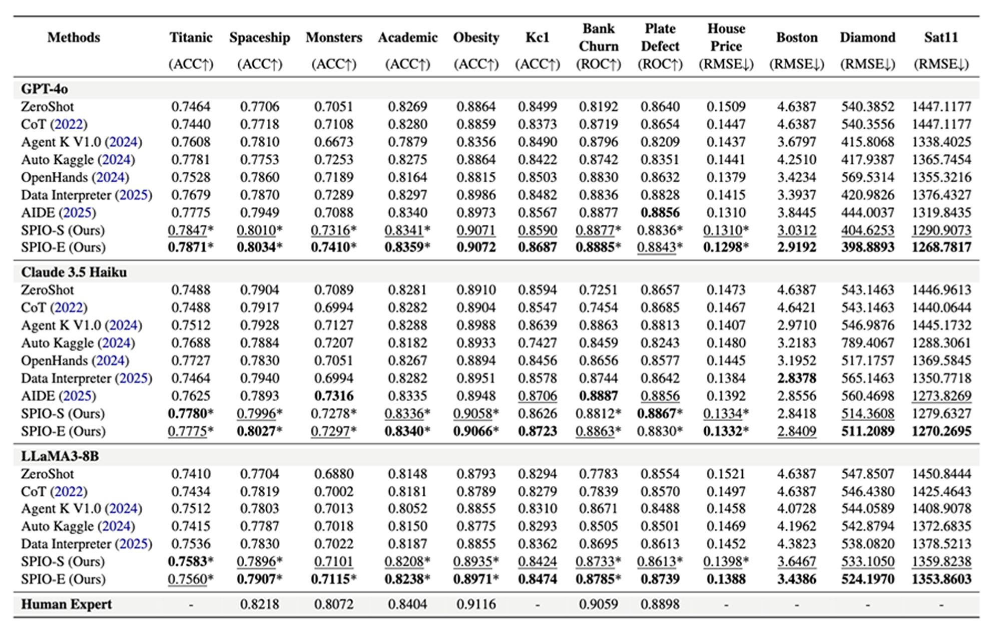 - Across 12 benchmark datasets from Kaggle and OpenML, SPIO consistently outperforms strong baselines such as Zero-shot, CoT, Agent K, AutoKaggle, OpenHands, Data Interpreter, and AIDE, with an average performance gain of 5.6 percent. Ablation studies further show that top-ranked plans are indeed better, top-2 ensembling works best overall, and feature engineering plus hyperparameter tuning contribute most to the gains.