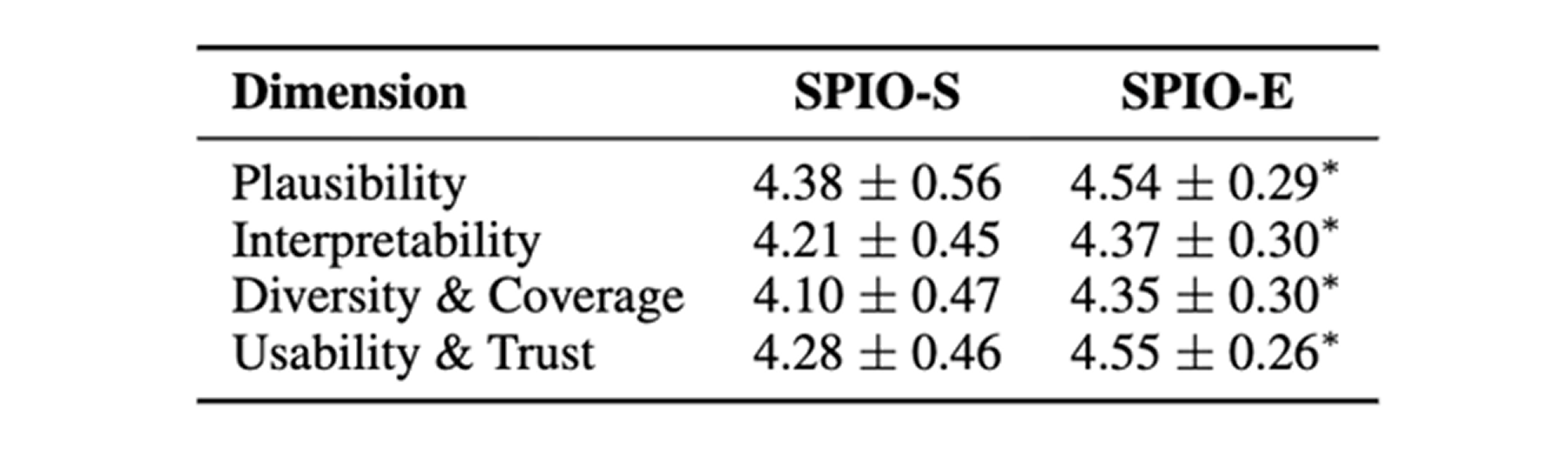 Beyond benchmark scores, the authors conduct an expert evaluation with 10 AI practitioners or graduate-level participants across 10 dataset-model pairs, yielding 100 evaluation instances. SPIO-E receives higher ratings than SPIO-S on plausibility, interpretability, diversity and coverage, and usability and trust. In a discrete plan-choice task, experts selected the top-ranked SPIO-E plan 72 percent of the time, which supports the claim that the framework’s internal ranking is aligned with human judgment.
