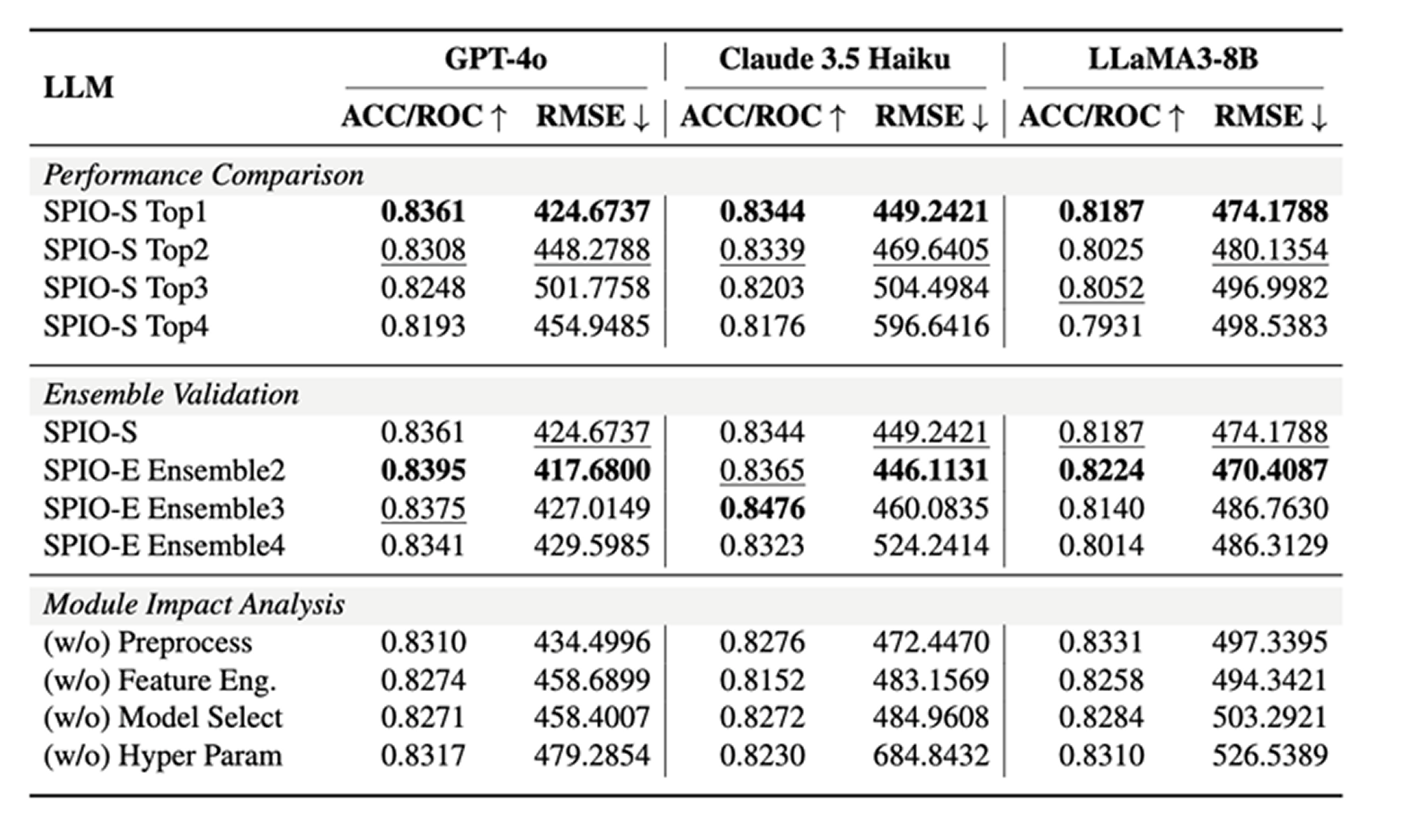 SPIO-E is the ensemble version. It selects the top-k plans, generates code for each one, and combines their predictions through soft voting for classification or averaging for regression. In the experiments, the framework generates up to two candidate plans per module, and SPIO-E typically ensembles the top two full pipelines.